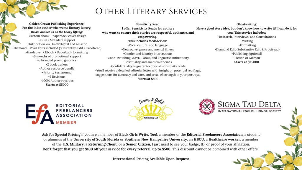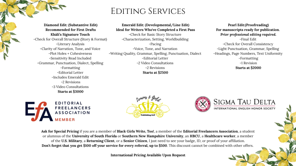 Let’s be real…every book needs an edit. But not just any edit. You need the luxury of having someone who sees your vision, keeps your voice intact, and knows how to polish without stripping the soul from your story, while you relax, enjoy your vacation, or spend time with your family.